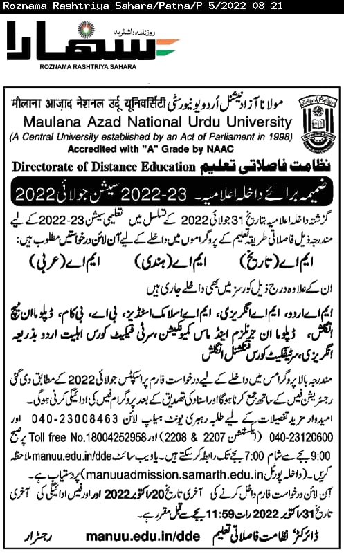 مولانا آزاد نیشنل اردو یونیورسٹی فاصلاتی تعلیم کے تحت پی- جی تاریخ،ہندی اور عربی میں داخلے مزید تفصیلات کے لیے لنک پر جائیں